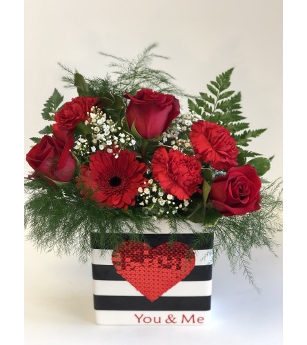 Remind someone special that, "It's Just You And Me", by gifting them with this vibrant arrangement designed in a keepsake, black and white striped vase with red sequin heart.